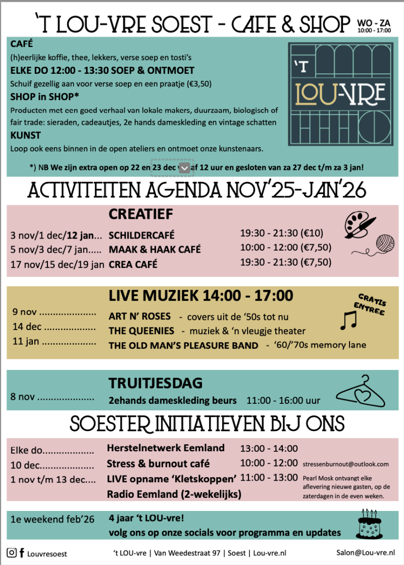 Wereldberoemd in Soest en ver daar buiten, bekend van B&B vol Liefde bij Eveline in Villa Polkadot: The Queenies! Liz & Herma zijn de koninginnen van de meezingers, gevoelige ballads en mooie popliedjes. Een stukje theater, emotie, een flinke dosis humor en misschien al een vleugje kerst? Dit alles interactief met het publiek. Zondag 14 december strijken ze neer in de salon van 'paleis' 't LOU-vre. Komen jullie ook op audiëntie? Hartelijk welkom, bien venue. De entree kost je niets, c'est gratuite!